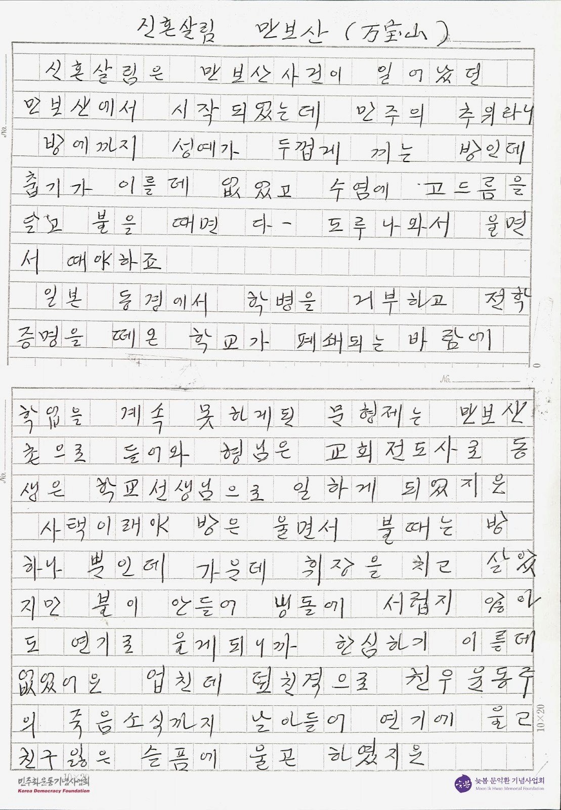 박용길의 손글씨는 정갈하고 가독성이 뛰어나 읽는 맛이 있다. 또 문장이 간결하고 생생해 쉽게 읽힌다. 200자 원고지에 또박또박 적은 박용길의 삶은 사건별로 구성되어 있는데 1944년 만주국 만보산 신혼시절, 해방과 3.8선을 넘은 사연, 1970년대 갈릴리교회, 방북 후 감옥에 간 일까지 다양하다. ‘헤여지다’, ‘슲음’ 등 현대 맞춤법과 다른 표기도 남아있다. 성실한 기록인의 흔적을 보노라면 뭔가 남기고 싶은 마음이 덩달아 생긴다. ‘봄길박용길체’로 오늘의 기록을 남겨보면 어떨까? 서체는 늦봄문익환기념사업회 웹사이트(