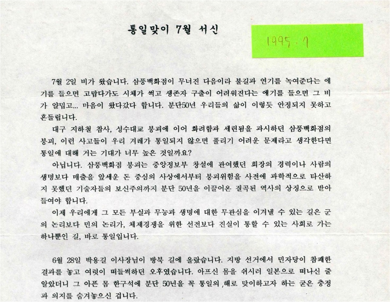 ◇삼풍백화점 붕괴 등 참사를 언급한 1995년 통일맞이 7월 서신. ⓒ늦봄문익환기념사업회