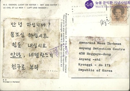 ◇‘양심수에게 편지보내기 캠페인’의 일환으로 네덜란드의 친구로부터 온 엽서. ⓒ늦봄문익환기념사업회