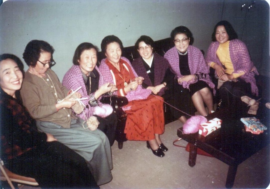 ◇빅토리숄을 걸치고 뜨개질 하는 있는 3.1 민주구국선언관련 가족들. 김석중, 고귀손, 박용길, 공덕귀, 이우정, 이태영, 이종옥 ⓒ늦봄문익환기념사업회