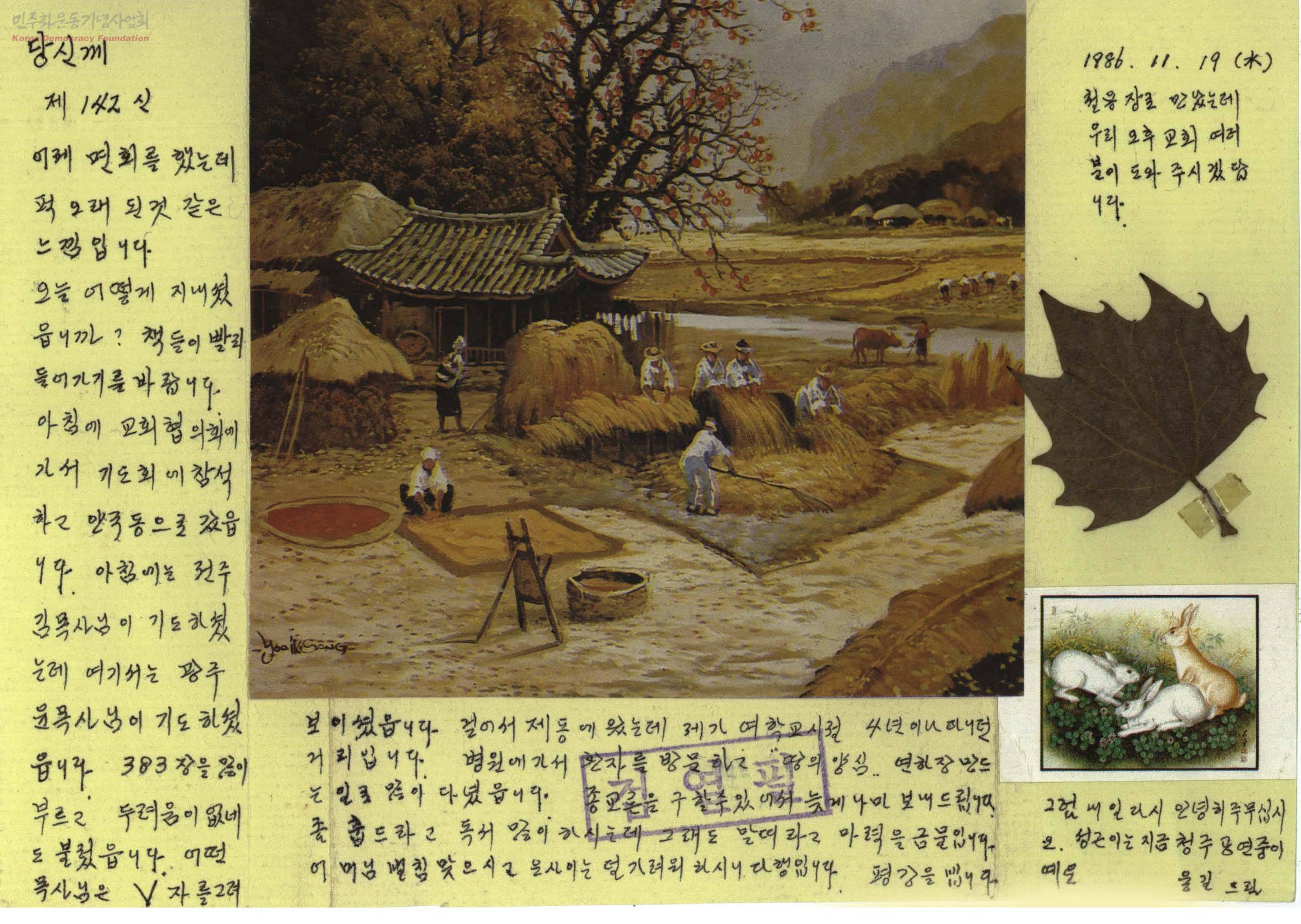 어제 면회를 했는데 퍽 오래될 것 같은 느낌입니다. 오늘 어떻게 지내셨읍니까? 책들이 빨리 들어가기를 바랍니다. 아침에 교회협의회에 가서 기도회에 참석하고 안국동으로 갔읍니다. 아침에는 전주 김 목사님이 기도하셨는데 여기서는 광주 윤 목사님이 기도하셨읍니다. 383장을 많이 부르고 두려움이 없네도 불렀읍니다. 어떤 목사님은 V자를 그려 보이셨읍니다 걸어서 제동에 왔는데 제가 여학교시절 4년이나 다니던 거리입니다. 병원에 가서 환자를 방문하고 "땅의 양심" 연하장 만드는 일로 많이 다녔읍니다. 종교론을 구할 수 있어서 늦게나마 보내드립니다. 좀 춥드라고 독서 많이 하시는데 그래도 말띠라고 마력을 금물입니다. 어머님 벌침 맞으시고 요사이는 덜 가려워 하시니 다행입니다. 평강을 빕니다. 그럼 내일 다시 안녕히 주무십시요. 성근이는 지금 청주 공연 중이예요 용길 드림
