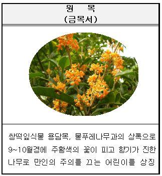 강동유치원 원목 금목서이다. 금목서는 꽃향기가 진한 나무로 만인의 주의를 끄는 어린이를 상징한다.
