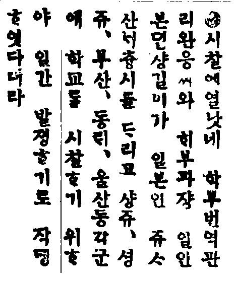 학부 번역관 리완응씨와 해부 과쟝 일인 본뎐샹길이가 일본인 쥬사 산내츙시를 데리고 샹쥬, 셩쥬, 부산, 동래, 울산 등 각군에 학교를 시찰하기 위하야 일간 발졍하기로 작뎡하엿다더라.
