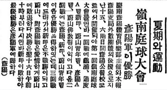 彦陽軍이 優勝 경남 彦陽體育俱樂部 주최와 본보 彦陽支局 외 數團體의 후원으로 지난 15, 6 양일간 언양공보교 코트에서 개최되야 제1회 영남정구대회를 연 바 1회전에 龜浦, 通度A템新坪, 蔚山靑年템, 彦陽A템, 蔚山佛敎틤이 익이고 다음 2회전에는 언양, 신평, 울산청년템이 각각 우승을 得하엿는데 3회전에 드러가서 신평은 부전승이 되고 울산, 對언양전은 애석하게 울산에 패퇴하다. 결승은 翌 16일 오전 10시부터 다시 연 바 신평이 패하야 최후 우승은 언양군에 歸하다. (언양)