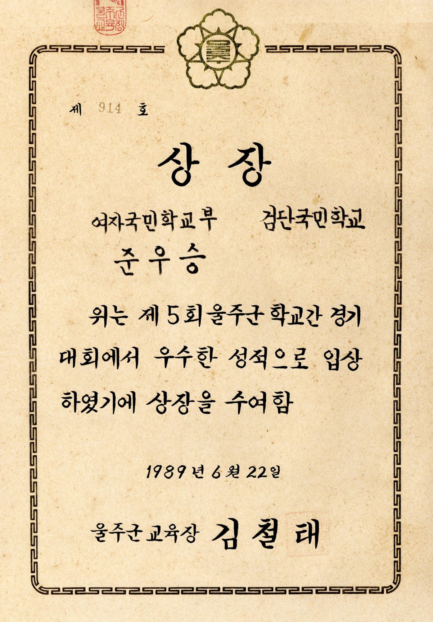 검단국민학교 1989년 제5회 울주군 학교간 경기대회에서 울주군교육청으로 부터 받은 여자국민학교부 준우승 상장