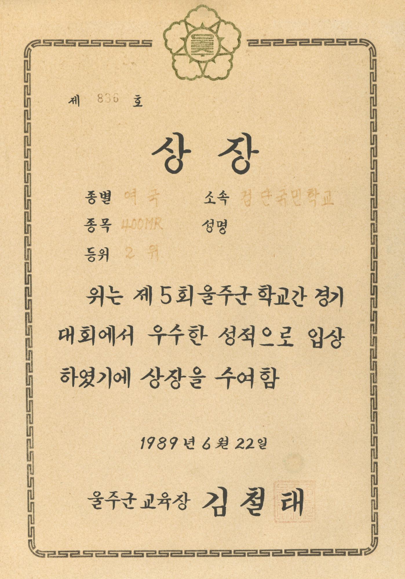 검단국민학교 1989년 제5회 울주군 학교간 경기대회에서 울주군교육청으로 부터 받은 여국 400MR 2위 상장