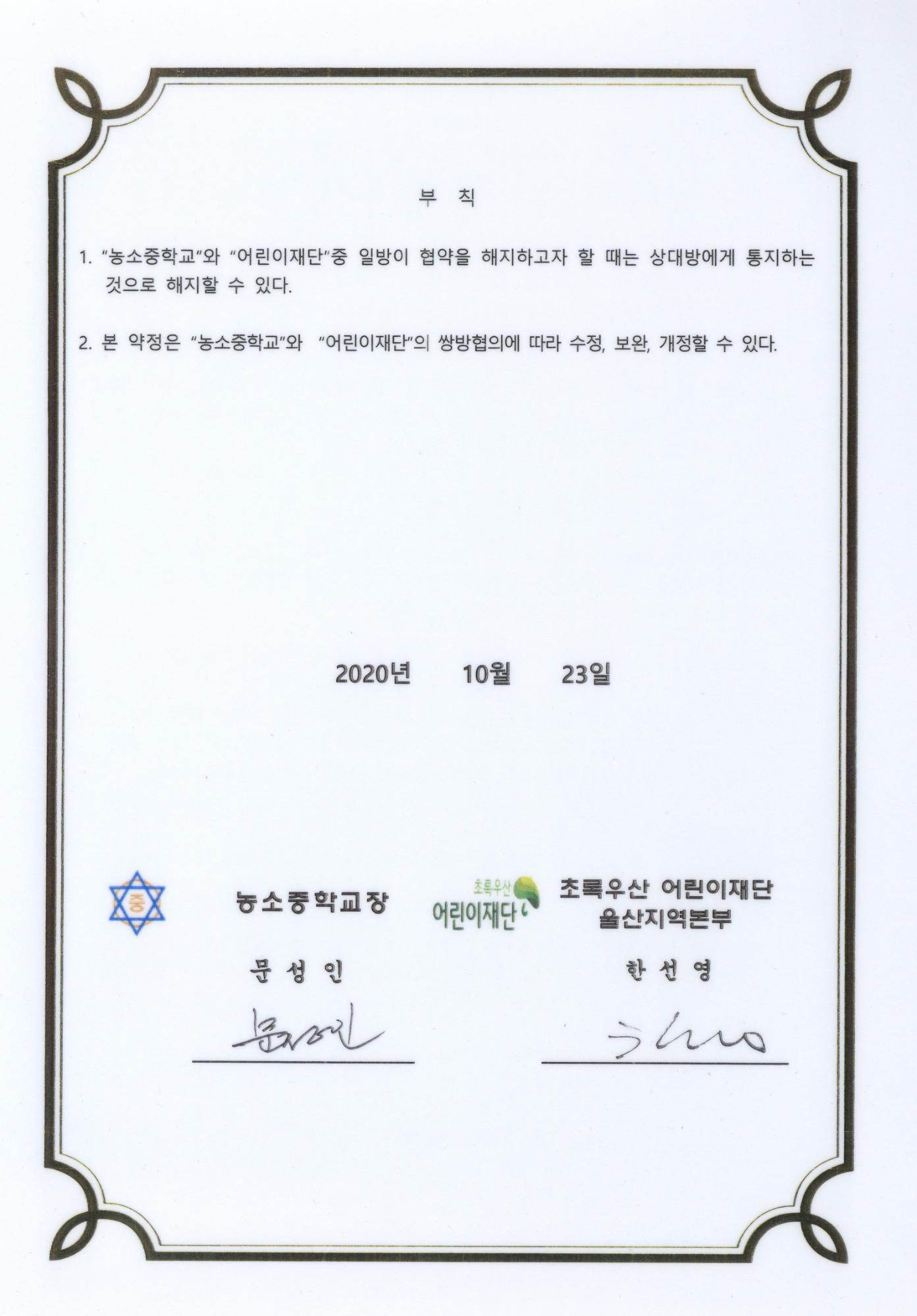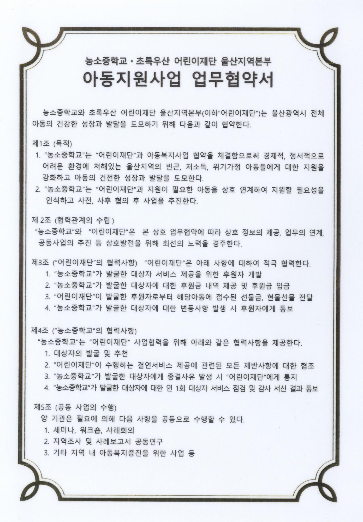 농소중학교 2020년 농소중학교-초록우산어린이재단울산지역본부 아동지원사업 업무협약서