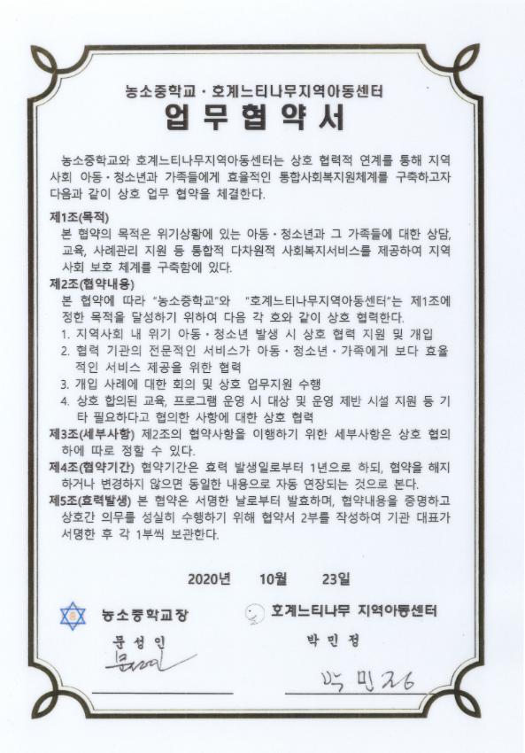 농소중학교 2020년 농소중학교-호계느티나무지역아동센터 업무협약서