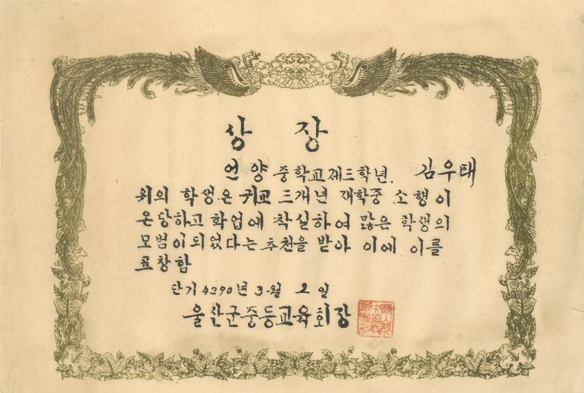 언양중학교 1957년 모범 표창 상장 김우태