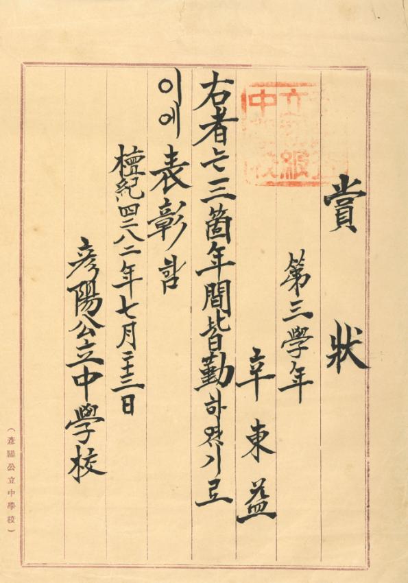언양공립중학교 단기4282년(1949년) 3학년 신동익이 받은 개근상 상장