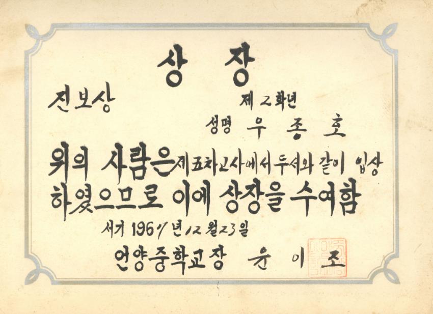 언양중학교 1967년 2학년 우종호가 받은 진보상 상장