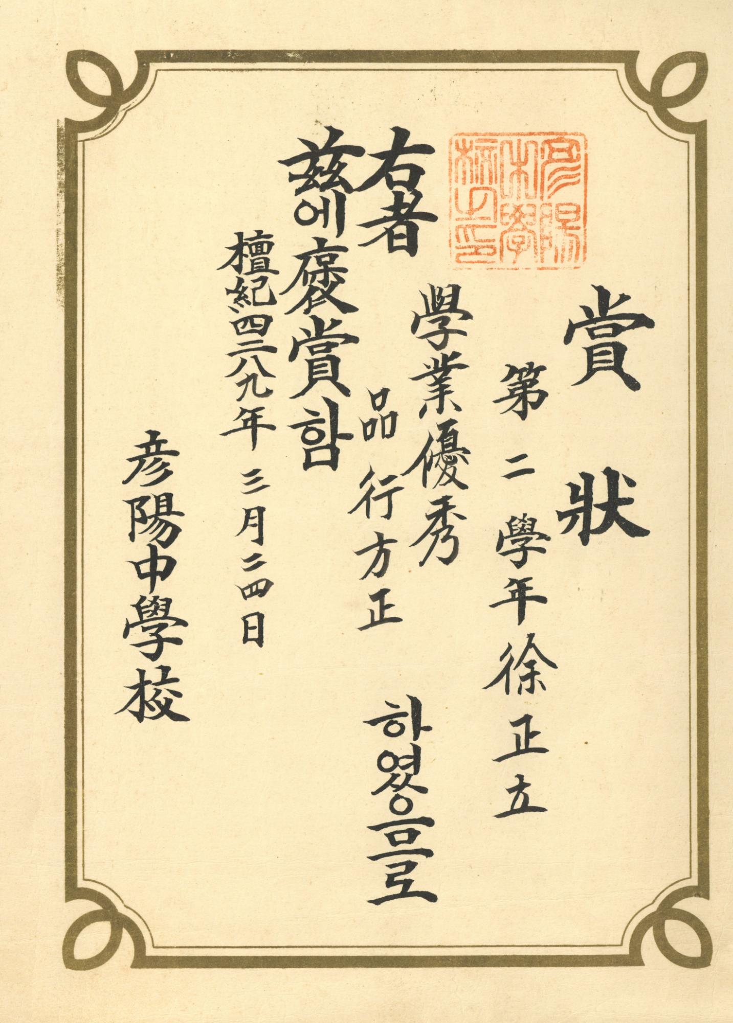 언양중학교 단기4289년(1956년) 2학년 서정립이 받은 학업우수상 상장