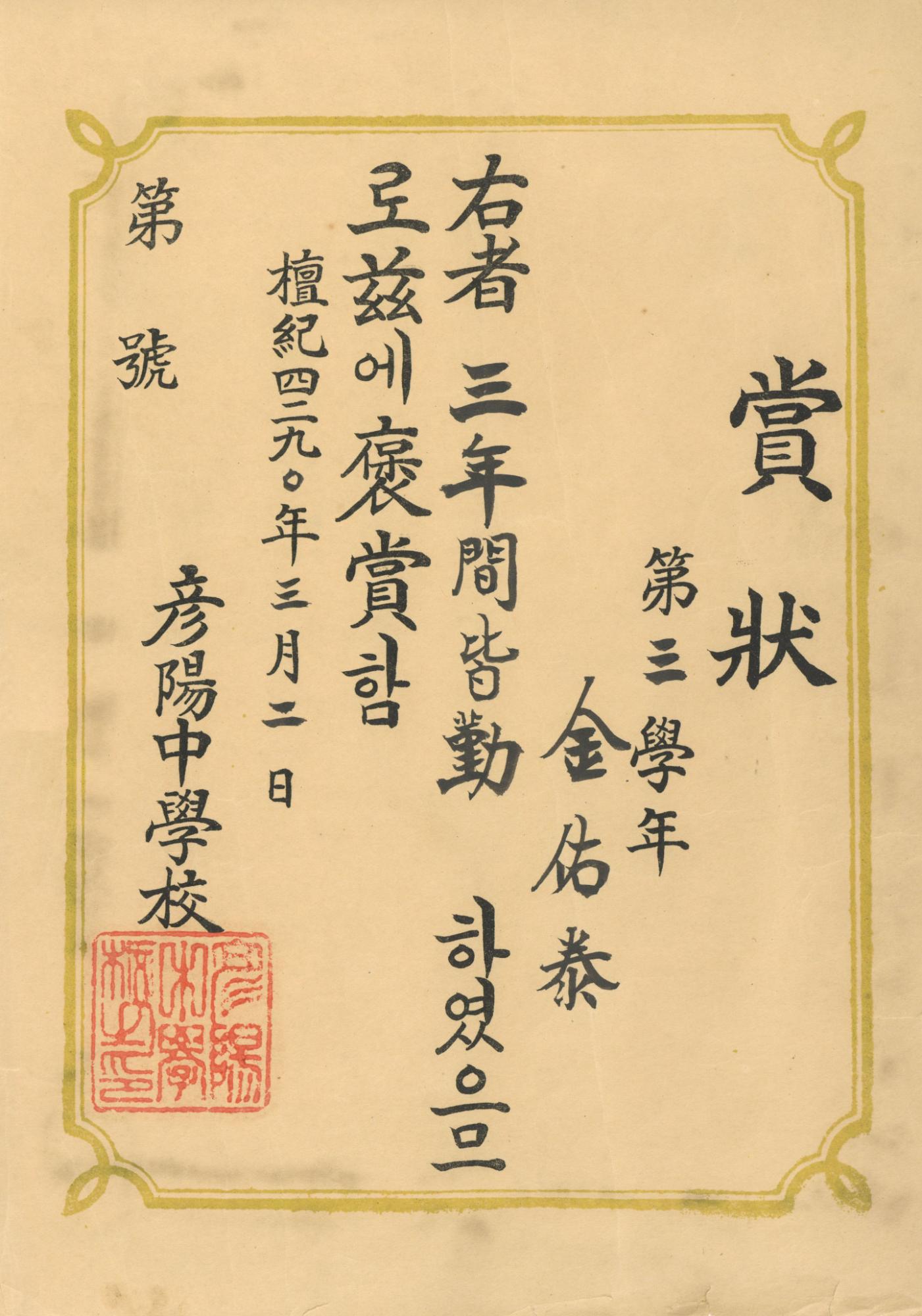 언양중학교 단기4290년(1957년) 3학년 김우태가 받은 3개년 개근상 상장