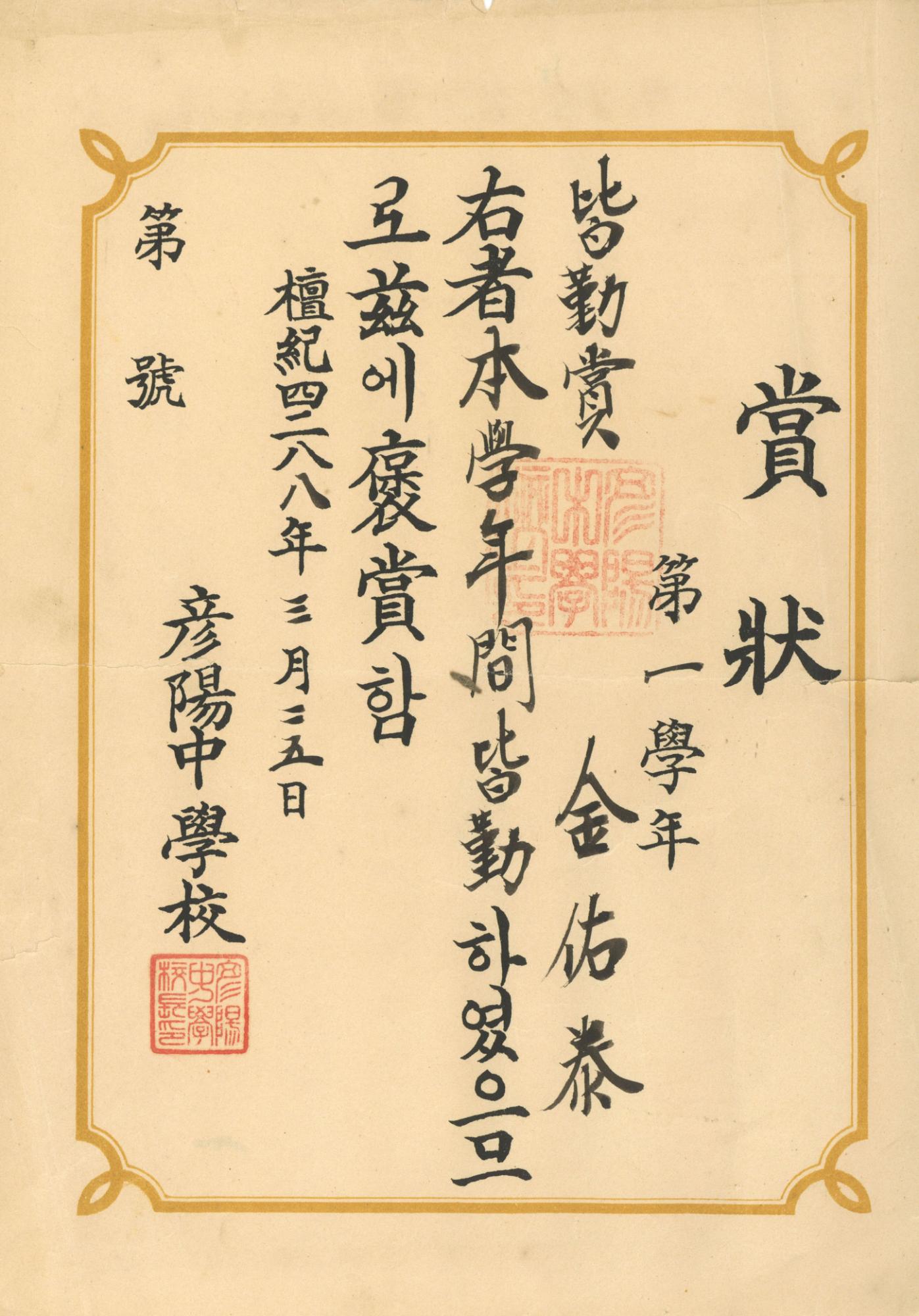 언양중학교 단기4288년(1955년) 1학년 김우태가 받은 개근상 상장
