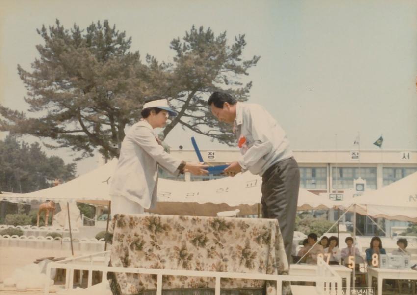 서생국민학교 1987년 장한 어머니상을 대리수상하고 있는 김봉려(비학)여사 부군 사진