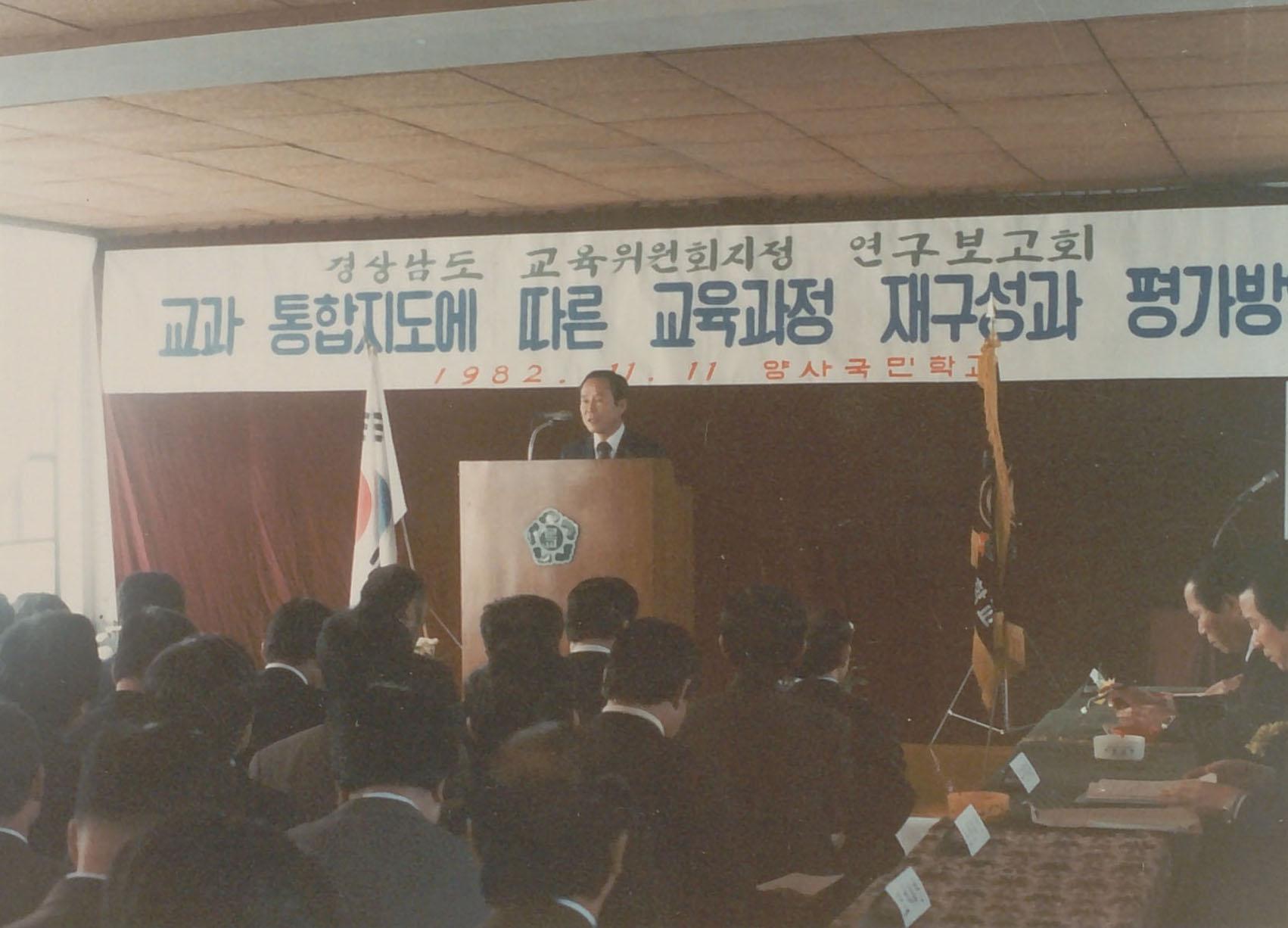 양사국민학교 1982년 경상남도 교육위원회 연구보고회(교과 통합지도에 따른 교육과정 재구성과 평가방안)_교육감 치사 및 지도 강평(인사계장)
