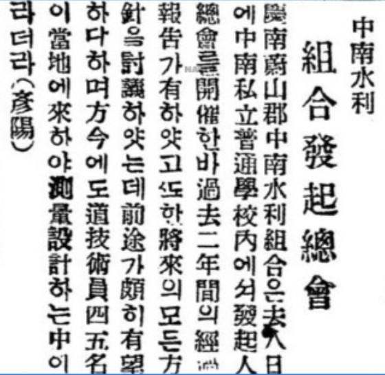 경남 울산군 중남수리조합은 지난 8일 중남사립보통학교 내에서 발기인 총회를 개최한 바, 지난해 경과보고가 있었고 또한 앞으로의 모든 방침을 토의하였는데 전도가 매우 유망하다하며 방금에도 기술원 4~5명이 해당 토지에 와서 측량설계하는 중이라더라(언양)
