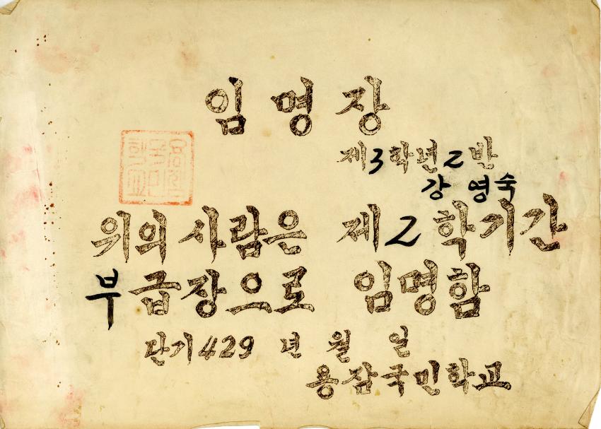 | 검색어 | 강영숙,용잠국민학교,임명장 |