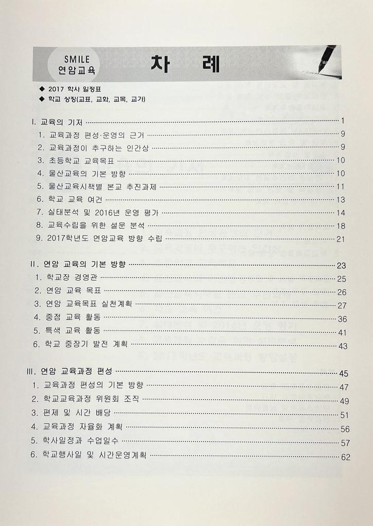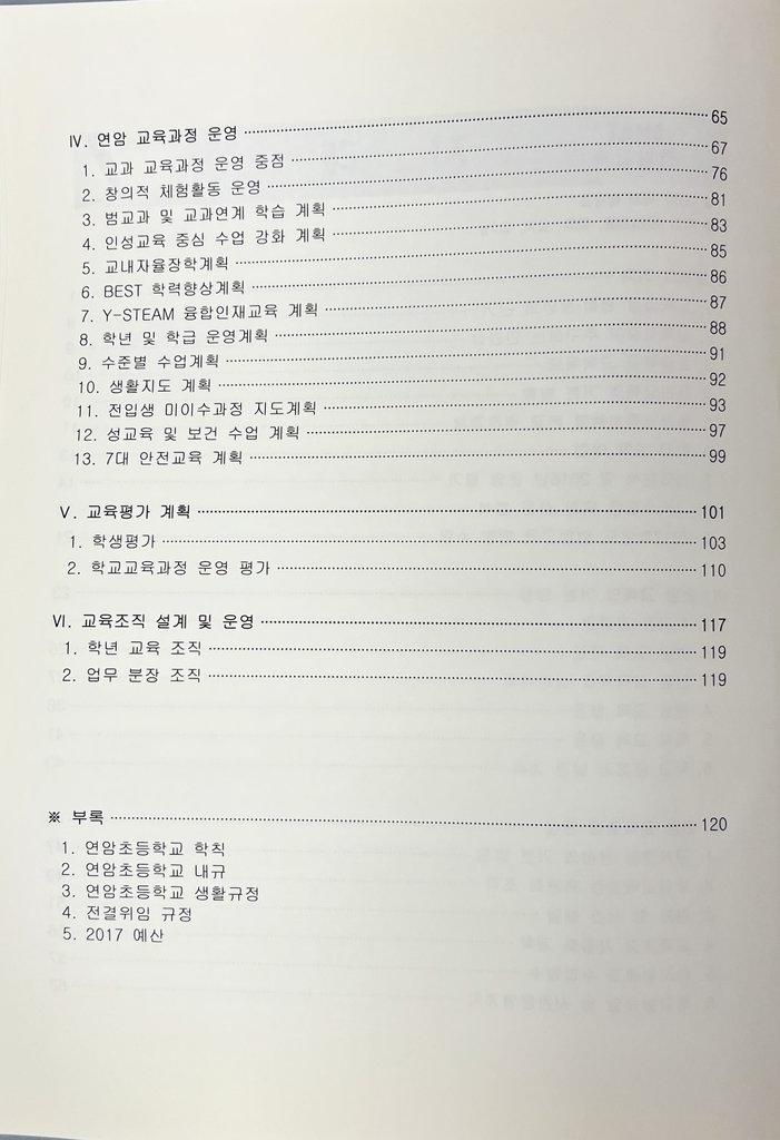 연암초등학교 효문분교장의 교육계획서로 2017년도 월별 행사계획을 시작으로 연암초등학교 효문분교장의 교육의기저, 연암교육의 기본방향, 연암교육과정 편성, 연암교육과정 운영, 교육조직설계, 교육활동 지원 계획등의 내용이 수록되어 있다.