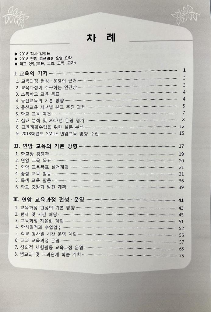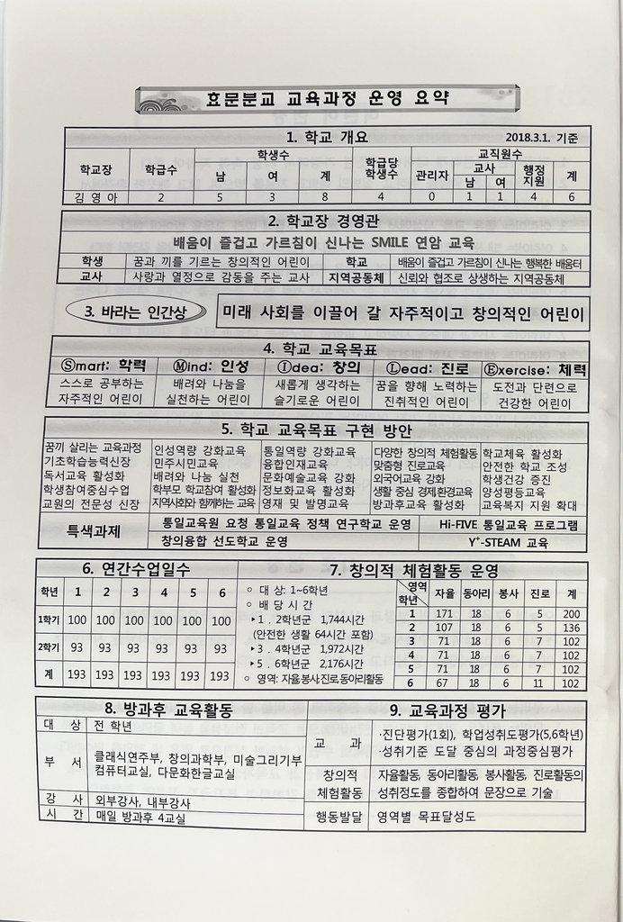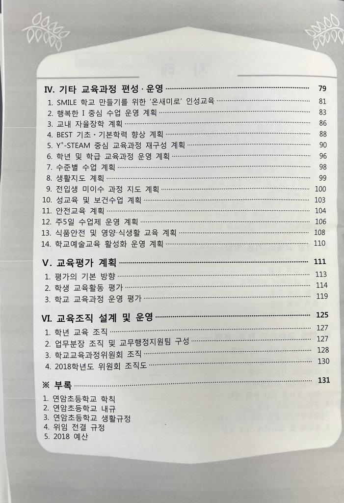 연암초등학교 효문분교장의 교육계획서로 2018년도 월별 행사계획을 시작으로 연암초등학교 효문분교장의 교육의기저, 연암교육의 기본방향, 연암교육과정 편성, 연암교육과정 운영, 교육조직설계, 교육활동 지원 계획등의 내용이 수록되어 있다.