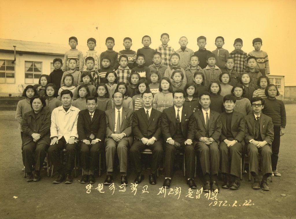 1972년 당월국민학교 제2회 졸업생들과 교직원들의 졸업기념 단체 사진이다.