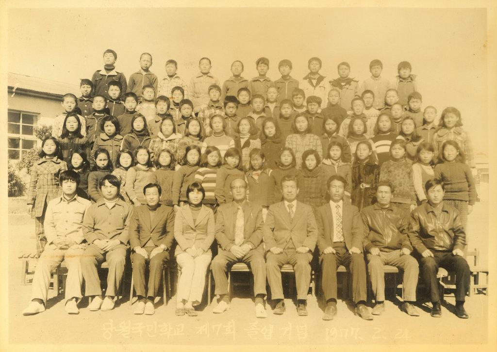 1977년 당월국민학교 제7회 졸업생들과 교직원들의 졸업기념 단체 사진이다.
