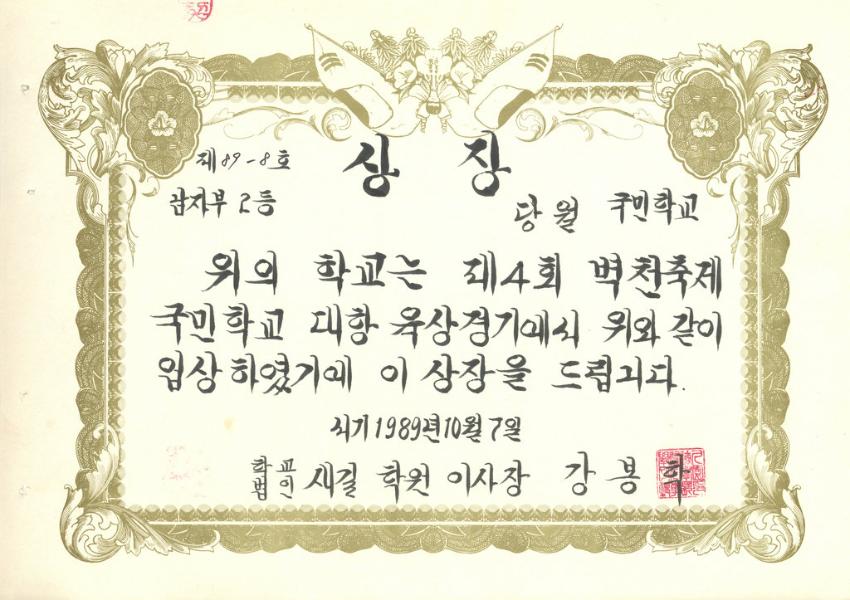 새길학원 이사장이 수여한 제4회 벽천축제 국민학교 대항 육상경기 당월국민학교 남자부 2등 상장이다. 학교상장철에 포함 되어있다.