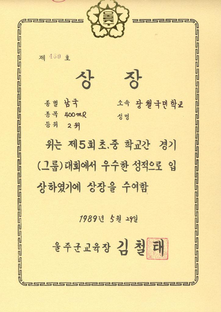 울주군 교육장이 수여한 제5회 초·중 학교간 경기(그룹) 대회 당월국민학교 남국 400MR 2위 상장이다. 학교상장철에 포함 되어있다.