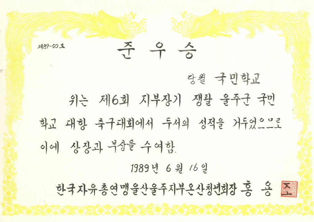 한국자유총연맹 울산울주지부 온산청년회장이 수여한 제6회 지부장기 쟁탈 울주군 국민학교 대항 축구대회 당월국민학교 준우승 상장이다.