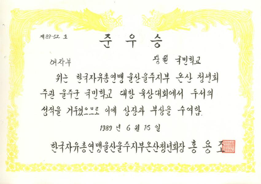 한국자유총연맹 울산울주지부 온산청년회가 주관한 울주군 국민학교 대항 육상대회 당월국민학교 여자부 준우승 상장이다. 학교상장철에 포함 되어있다.