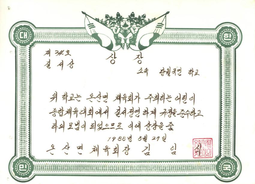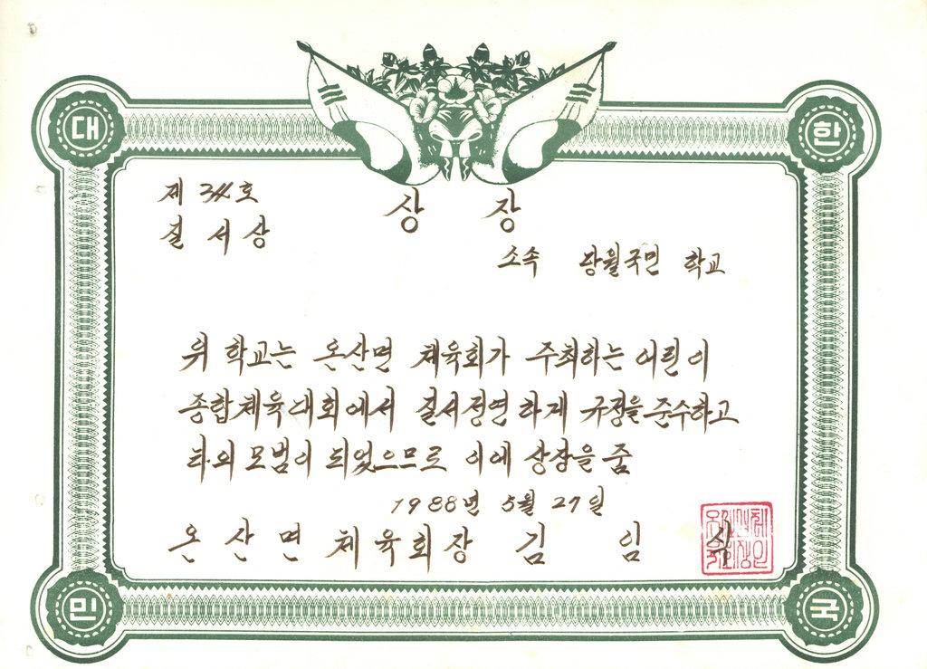 온산면 체육회장이 주최하는 어린이 종합체육대회 당월국민학교 질서상 상장이다. 학교상장철에 포함 되어있다.