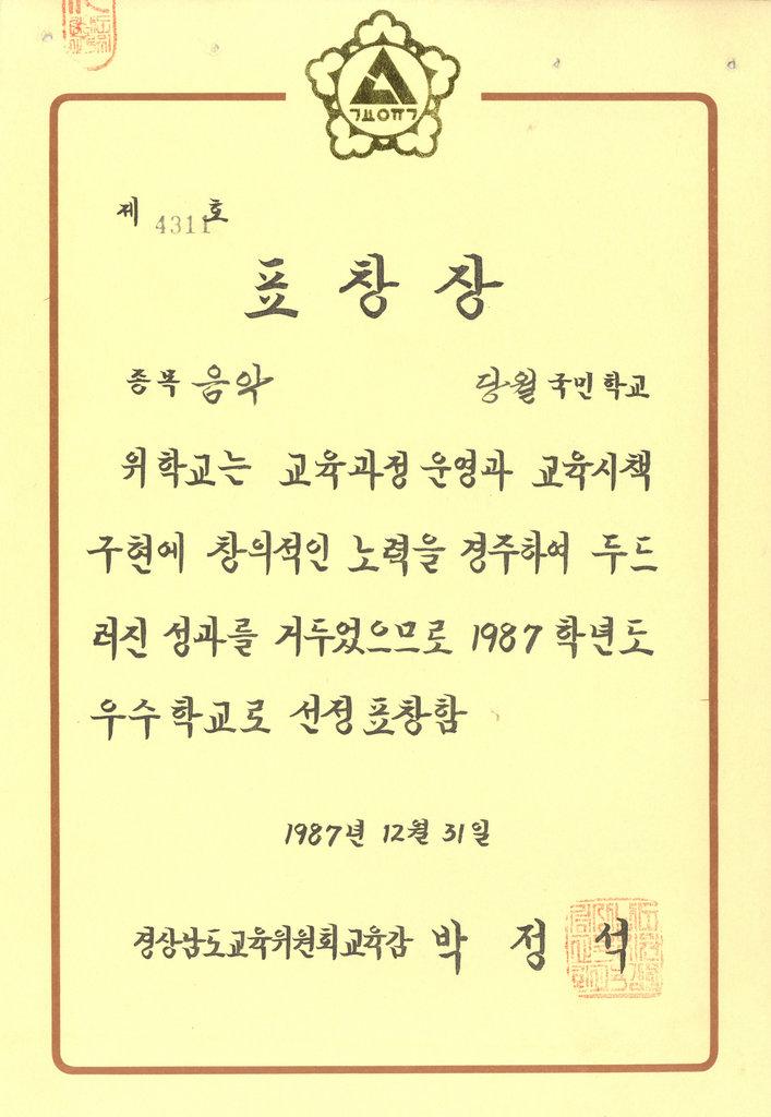 경상남도 교육위원회 교육감이 수여한 1987학년도 당월국민학교 음악 종목 우수학교 표창장이다. 학교상장철에 포함 되어있다.