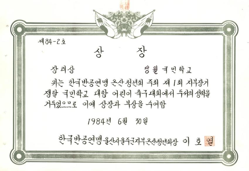 한국반공연맹 온산청년회가 주최한 제1회 지부장기 쟁탈 국민학교 대항 어린이 축구대회 당월국민학교 장려상 상장이다.