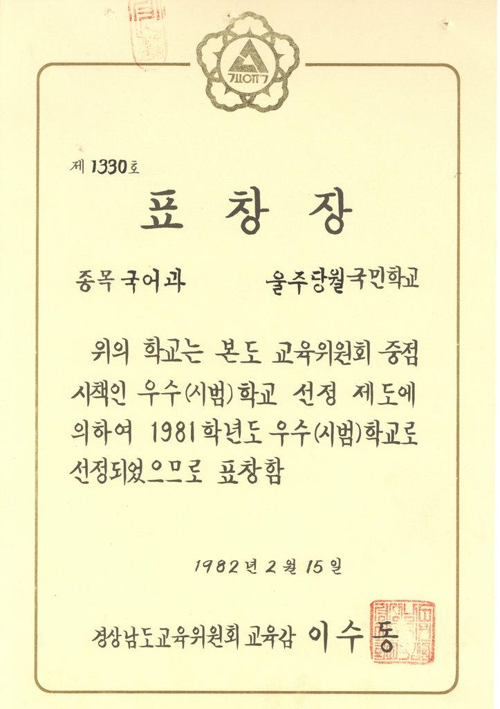 경상남도 교육위원회가 수여한 1981학년도 울주 당월국민학교 국어과 우수(시범)학교 표창장이다. 학교상장철에 포함 되어있다.