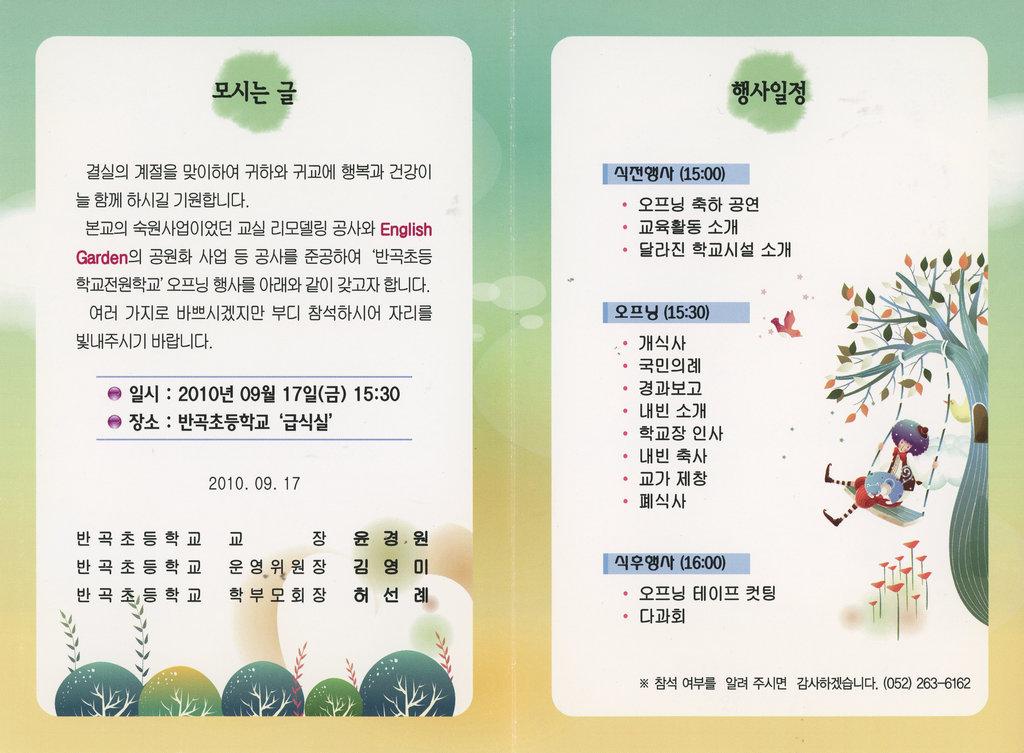 반곡초등학교 교실 리모델링 공사와 english garden의 공원화 사업등 공사를 준공해 '반곡초등학교전원학교'오프닝행사를 안내 리플렛이다.