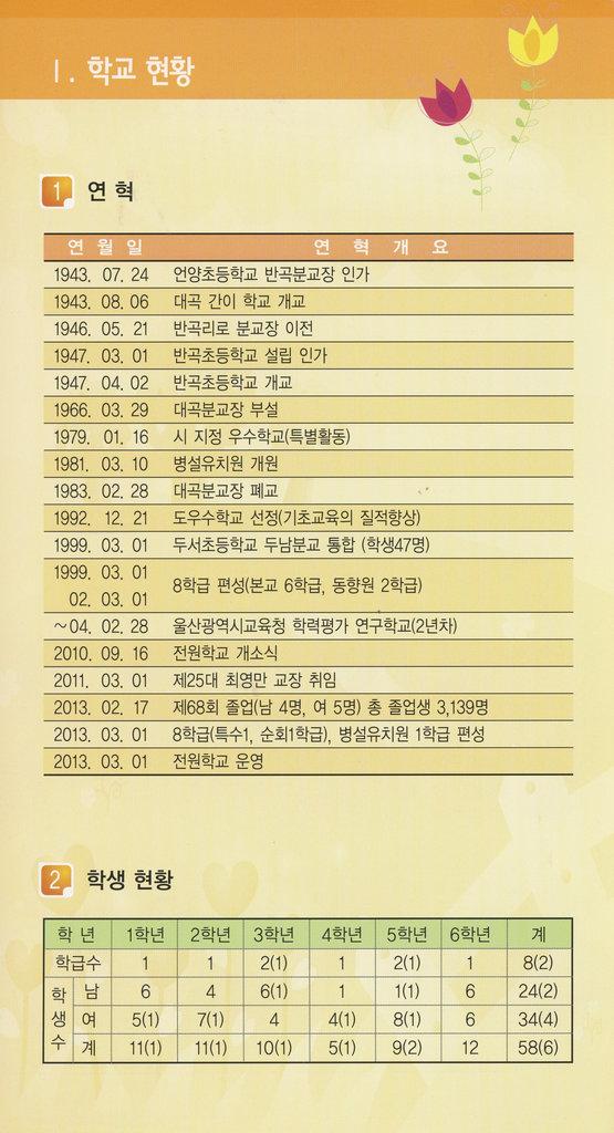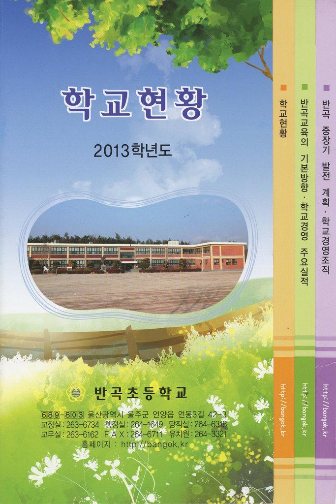 반곡초등학교 2011년도의 학교현황과 반곡교육목표, 학교경영주요실적, 학교경영주요실적과 학교경영조직에 대해 적혀 있는 팜플렛이다.