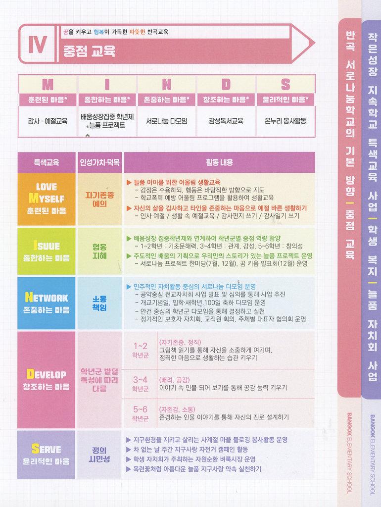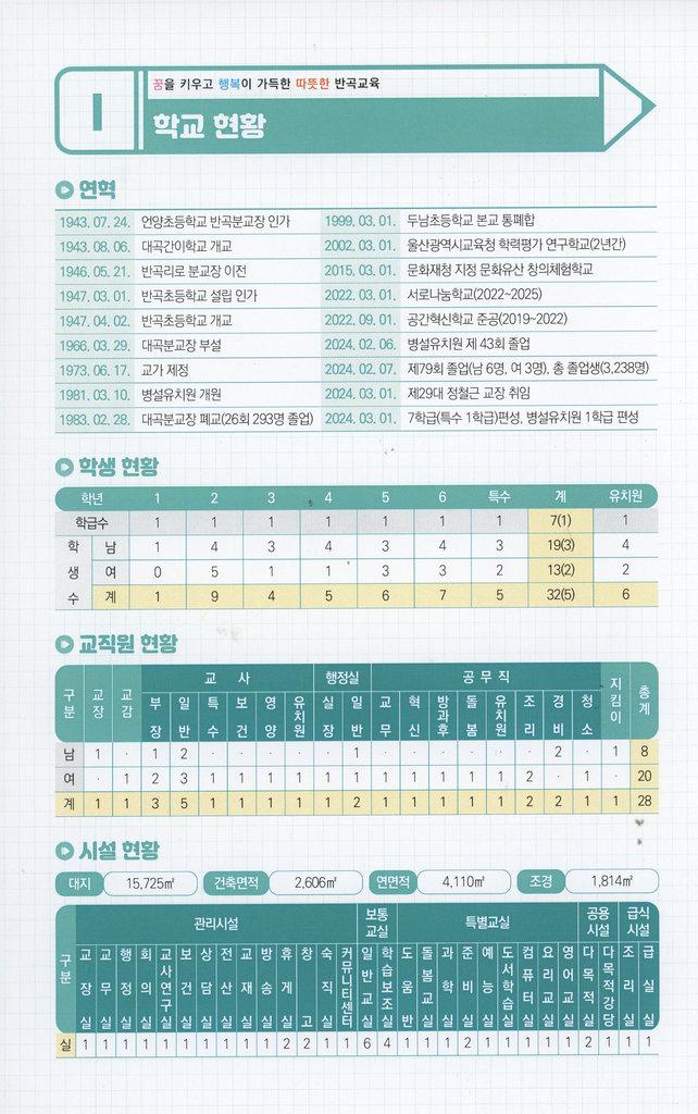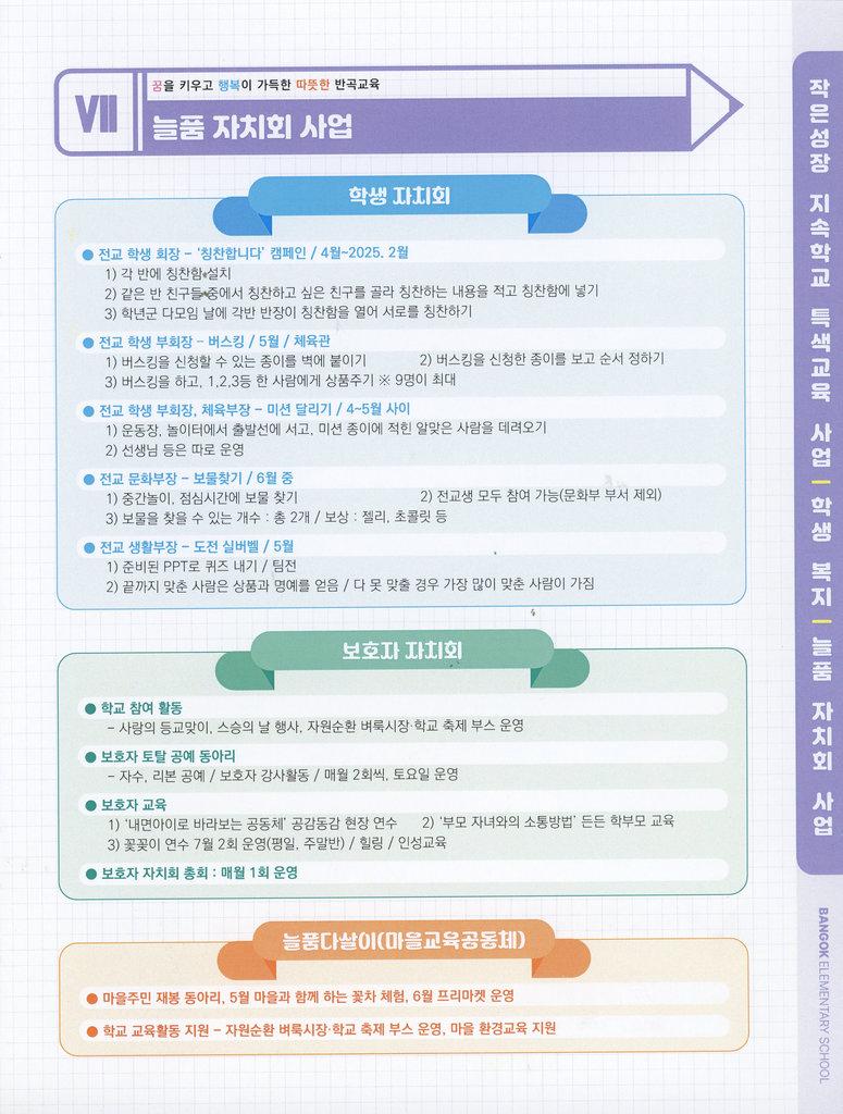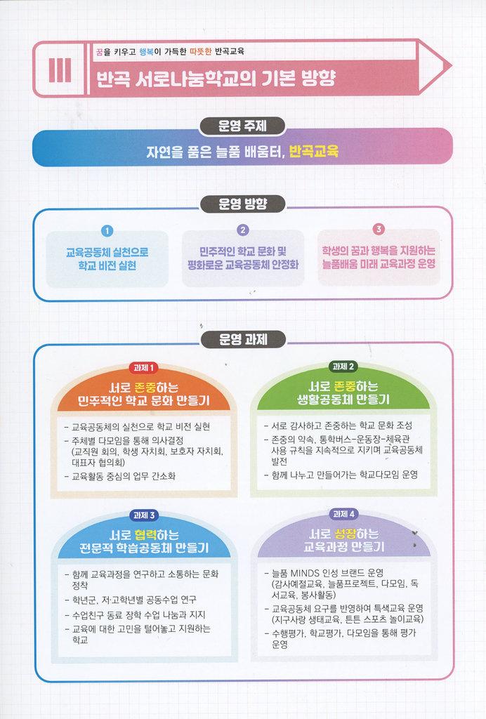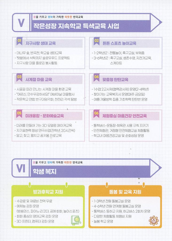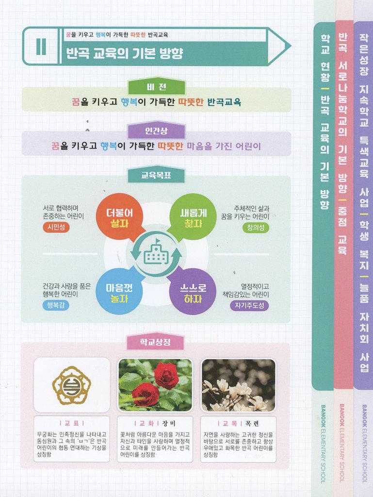반곡초등학교 2024년도의 학교현황과 반곡교육의 기본방향, 반곡서로나눔학교의 기본방향과 중점교육, 작은성장 지속학교 특색교육사업과 학생복지 그리고 늘품 자치회 사업에 대한 내용이 적힌 팜플렛이다.