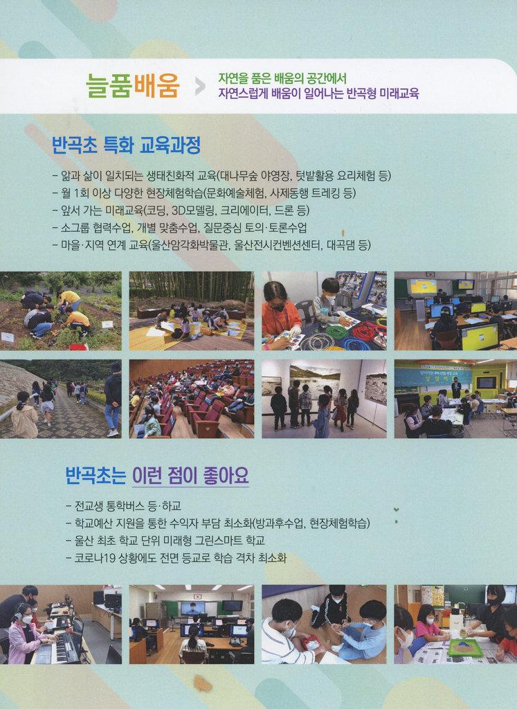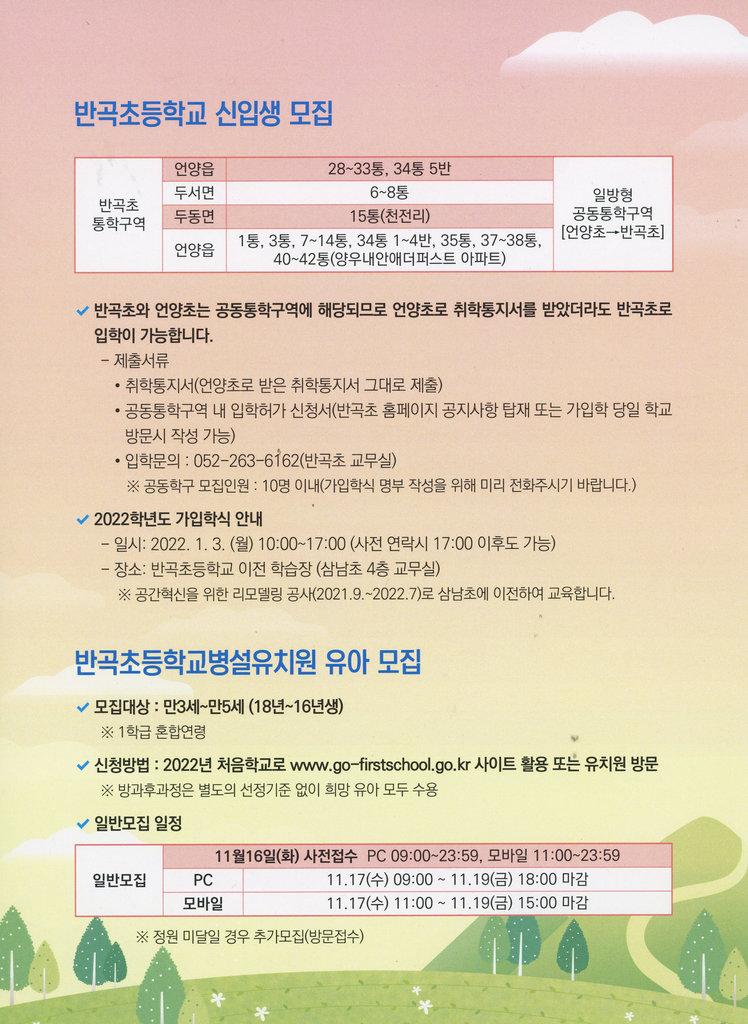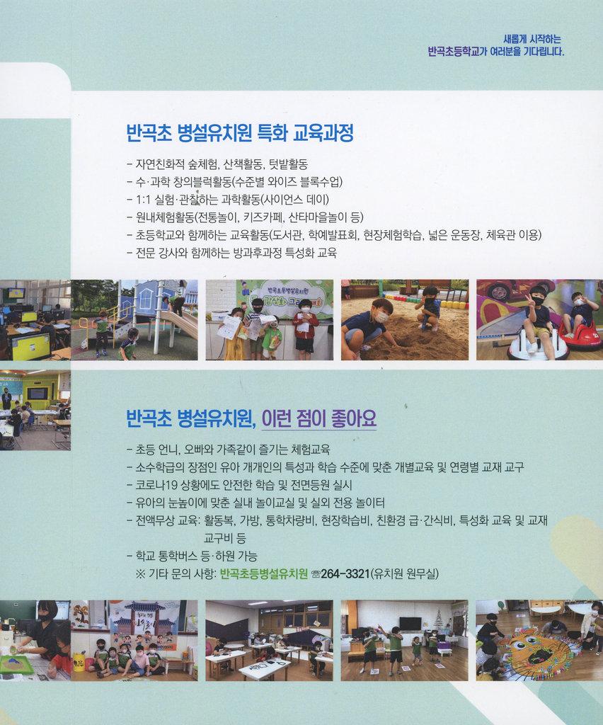 2022학년도 반곡초등학교의 특화교육과정, 반곡초등학교 신입생모집과 반곡병설유치원의 장점과 신입생을 모집하는 내용을 담은 팜플렛이다.