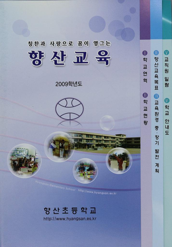 2009학년도의 향산초등학교 안내 팜플렛으로 연혁,현황,교육목표 및 중점사항과 교육목표, 중점교육활동 그리고 교직원일람, 학교안내도 등의 내용이 실려있다.
