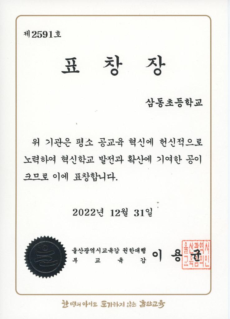 삼동초등학교가 혁신학교 관련 받은 교육감 표창장이다.