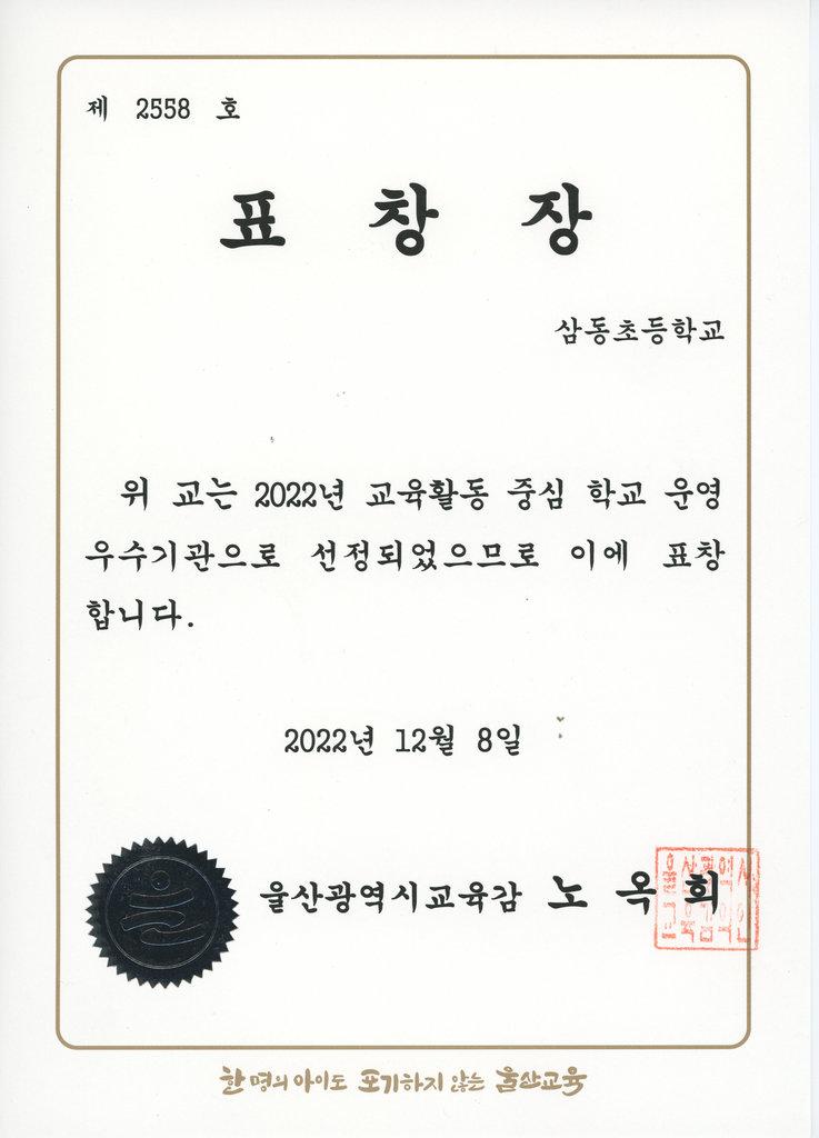 삼동초등학교가 2022년 교육활동 중심 학교 운영 우수기관으로 선정되어 받은 표창장이다.