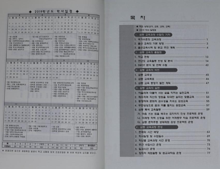 2019년 삼동초등학교 교육계획서이다. 삼동 교육의 바탕, 삼동 교육의 지향, 삼동 교육의 편성등 삼동 교육계획이 수록되어 있다.