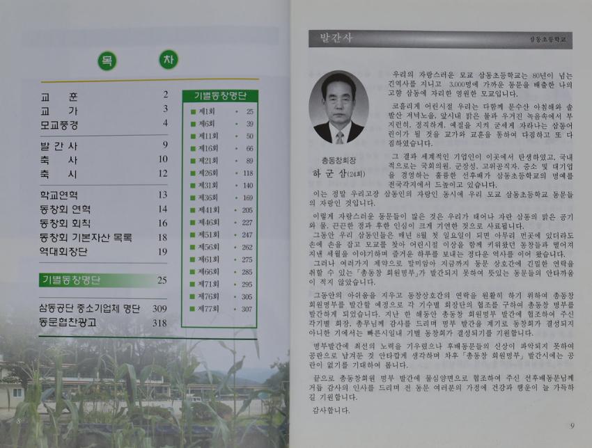 삼동초등학교의 교훈과 교가, 발간사,축사,학교연혁등의 학교에 대한 정보가 담긴 내용들과 동창명단이 적힌 회원명부이다.