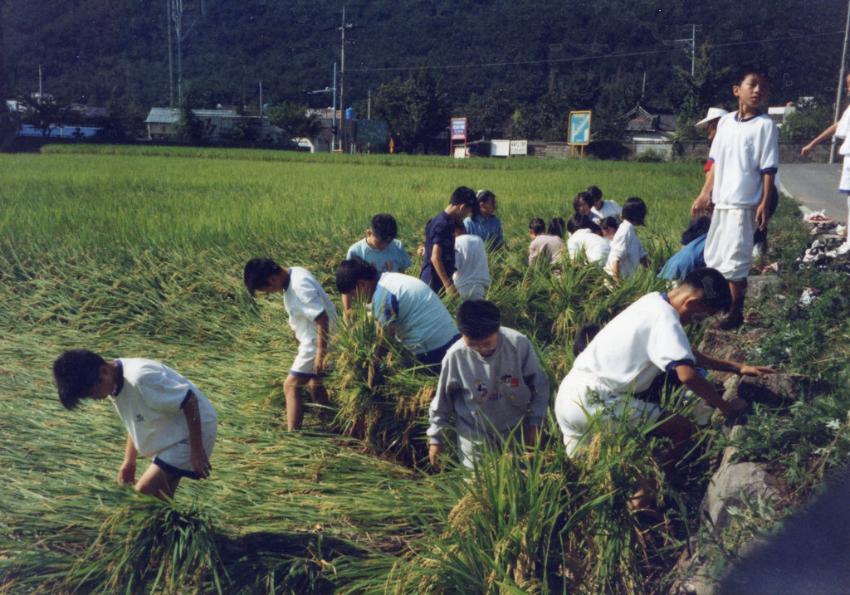 궁근정국민학교 학생들의 벼세우기 광경