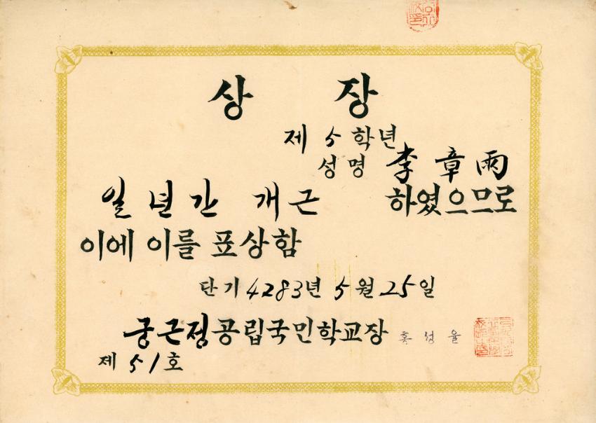 궁근정공립국민학교에 이장우 학생의 5학년 개근상장이다.