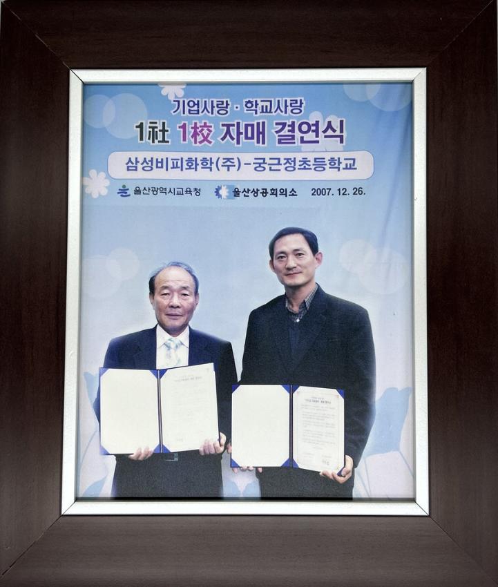 삼성비피화학㈜ 궁근정초등학교 1사1교 자매결연식 기념사진이다.