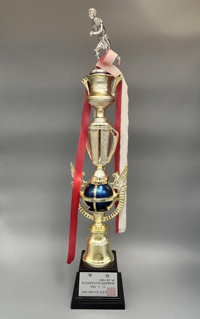 상북초등학교에 보관되어 있는 제2회 상북면 내 3개국교 합동체육대회 400m 계주 남 우승 트로피다.