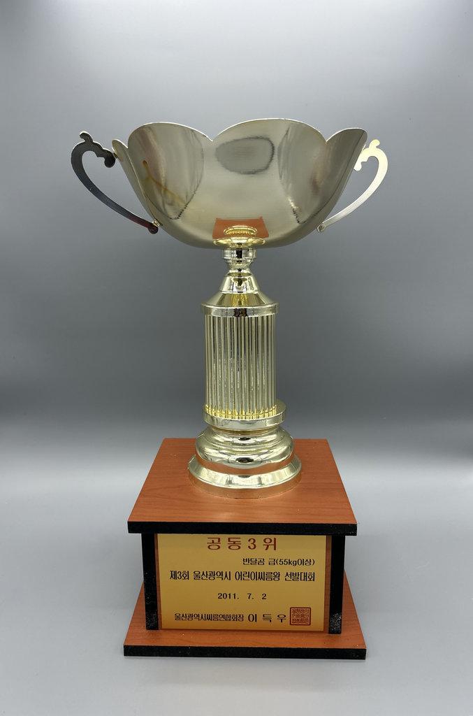 울산광역시 씨름연합회가 주최한 제3회 울산광역시 어린이 씨름왕 선발대회에서 반달곰급(55kg이상) 공동 3위를 하여 받은 트로피다.