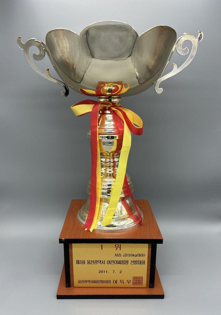 울산광역시 씨름연합회가 주최한 제3회 울산광역시 어린이 씨름왕 선발대회에서 사슴급(55kg이하) 1위를 하여 받은 트로피다.