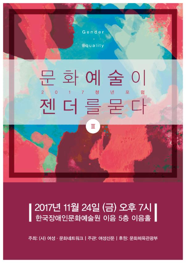 2017 양성평등문화 환경조성사업의 일환으로 진행된 양성평등문화 환경조성 청년포럼 Ⅲ- "2017 청년포럼 문화예술이 젠더를 묻다 시즌 3" 포스터.